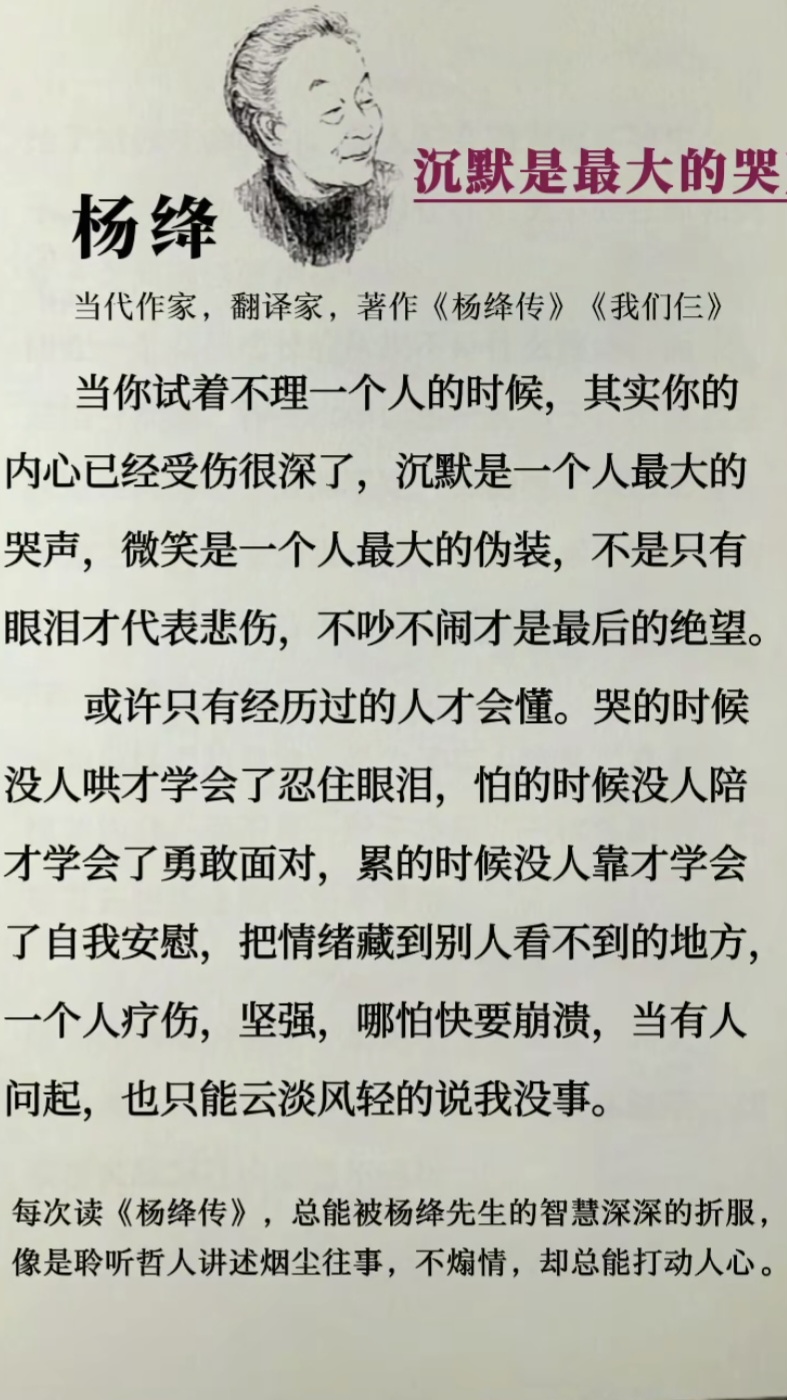 《杨绛传》里面的治愈名句(三) 抚琴居 04-08 1426 默认 摘要: ... 标签: 杨绛 杨绛传 哲理 治愈 海报 阅读 QQ 分享 微博分享 微信分享 分享 上一篇诗文作品《杨绛传》里面的治愈名句(二) 下一篇诗文作品当白话遇上古诗文(三) 《杨绛传》里面的治愈名句(二)上一篇诗文作品 当白话遇上古诗文(三)下一篇诗文作品 相关诗文 杨绛杨绛传哲理治愈 贪嗔痴慢疑 2025-11-21 众生赋 2025-11-21 吊带裙 邬霞 2025-05-22 绝美古风诗文(三) 2025-04-14 绝美古风诗文(二) 2025-04-14 绝美古风诗文(一) 2025-04-14 当白话遇上古诗文(九) 2025-04-14 当白话遇上古诗文(八) 2025-04-14